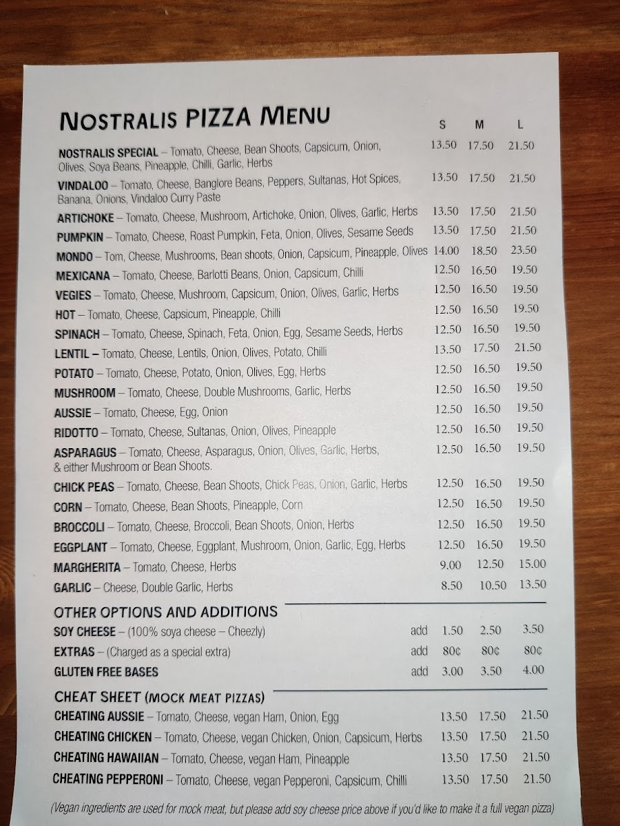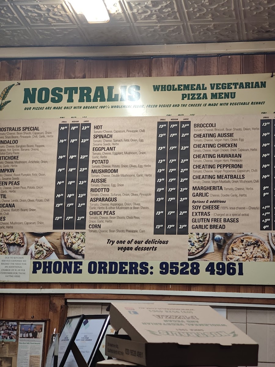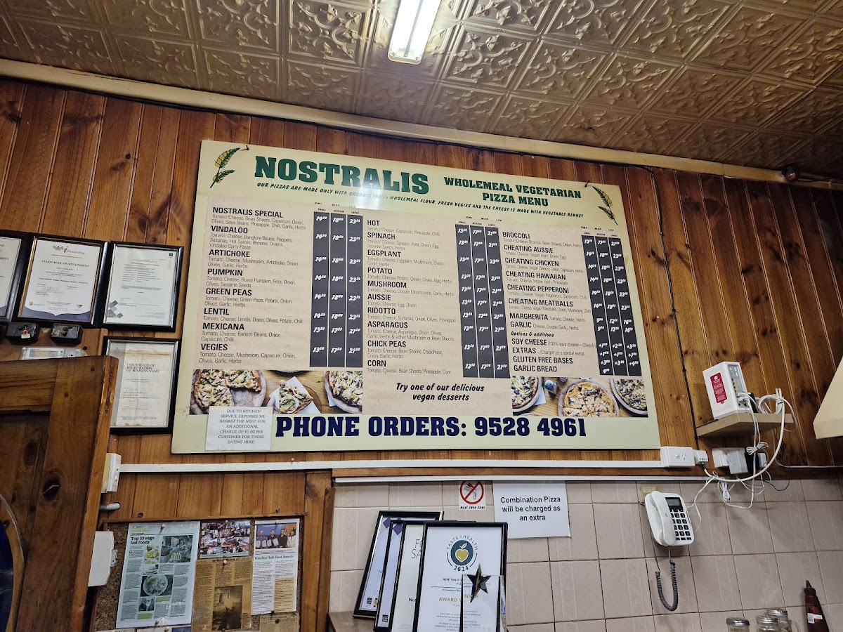 The menu at Nostralis Wholemeal Vegetarian & Vegan Pizza offers a delightful selection of pizzas and other items catering to vegetarian and vegan preferences. The Medium Pizza section features unique options such as Eggplant Pizza, Chick Peas Pizza, Hot PizzaCorn Pizza, and Pumpkin Pizza, each offering a different combination of flavors. For larger appetites, the Large Pizza options include Hot Pizza, Lentil Pizza, Asparagus Pizza, Mushroom Pizza, and Pumpkin Pizza. Smaller portions are available in the Small Pizza range, with choices like Asparagus Pizza, Pumpkin Pizza, Ridotto Pizza, Vindaloo Pizza, and the popular Cheating Aussie. If you're in the mood for a combination, the restaurant also offers Single Combo, Double Combo, and Family Combo, providing a variety of tastes in one meal. On the side, the Garlic Bread is a perfect addition. For beverages, diners can choose from Water, Juice Glass Bottle, Bundaberg Glass Bottle Soda, and Coke 1.25L. A small but convenient selection of Single-Use Items like Straw, Napkins, and Cutlery are also available. To satisfy your sweet tooth, don't miss the Vegan Cake of the Day, a perfect vegan dessert to end your meal. With a range of pizzas, combos, and sides, Nostralis offers a variety of options that cater to both vegetarians and vegans, ensuring a satisfying meal for all.
