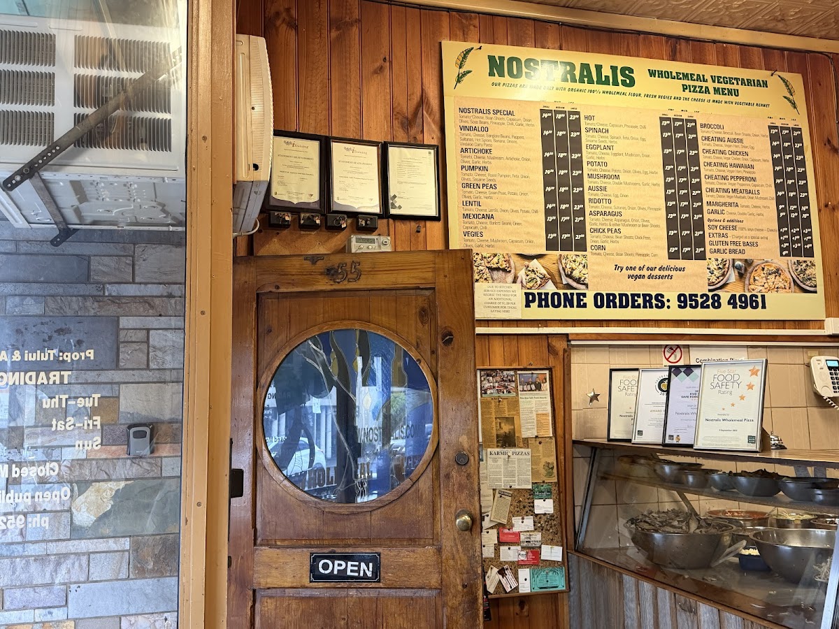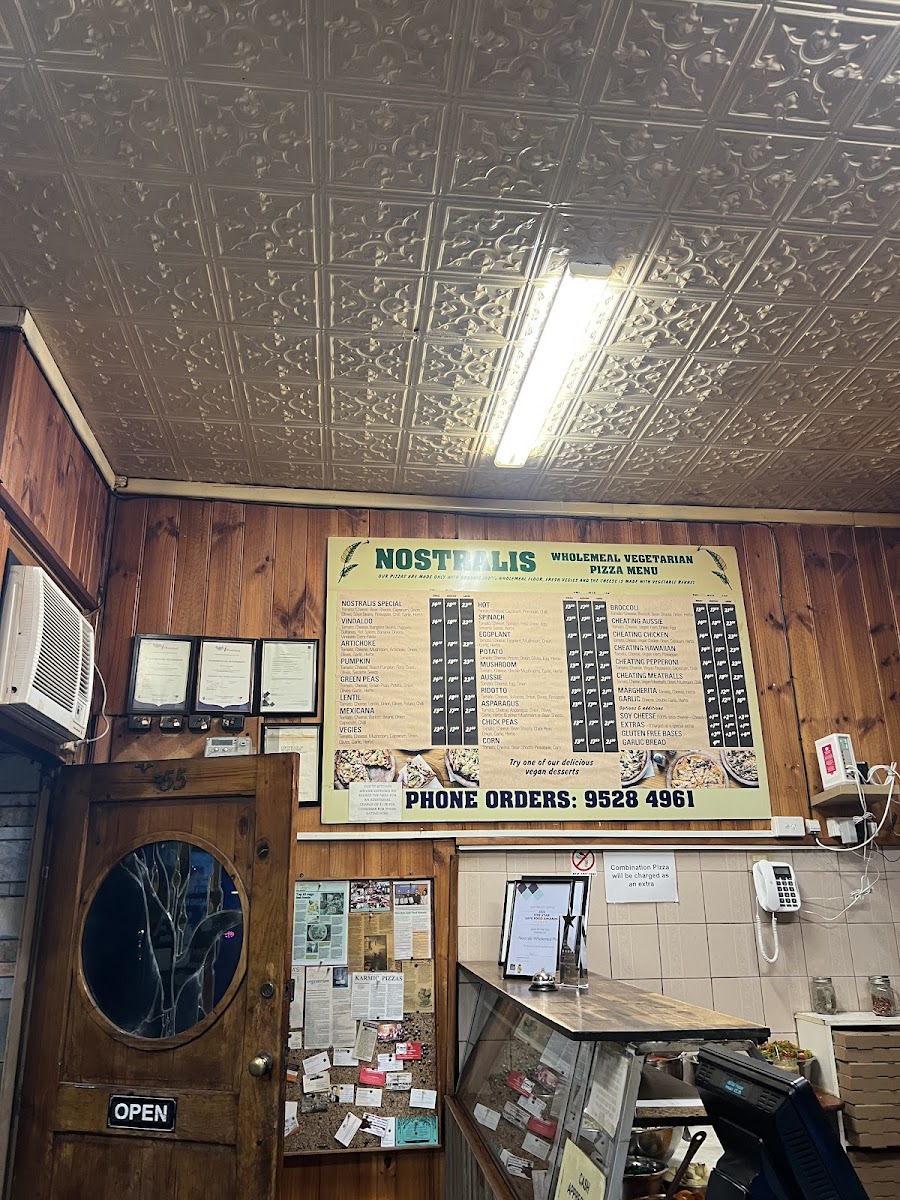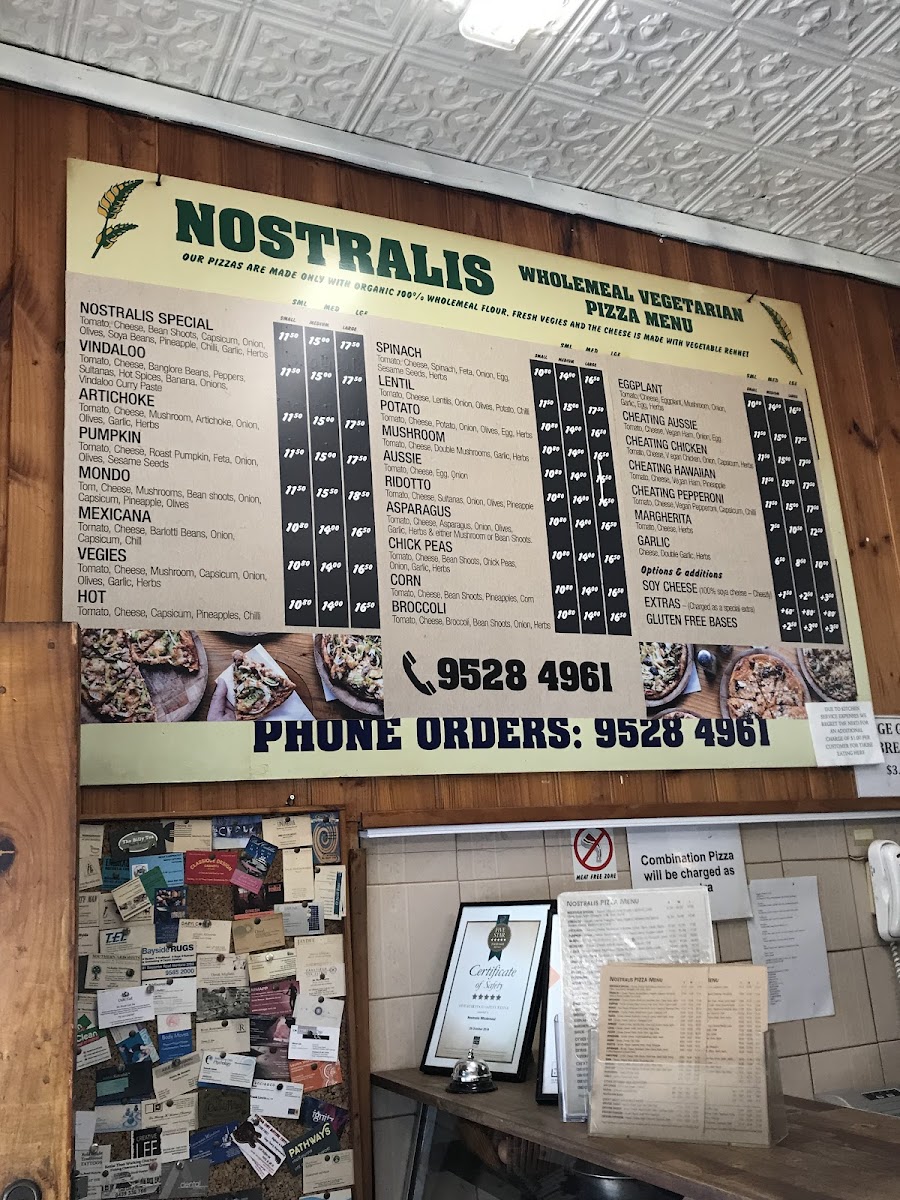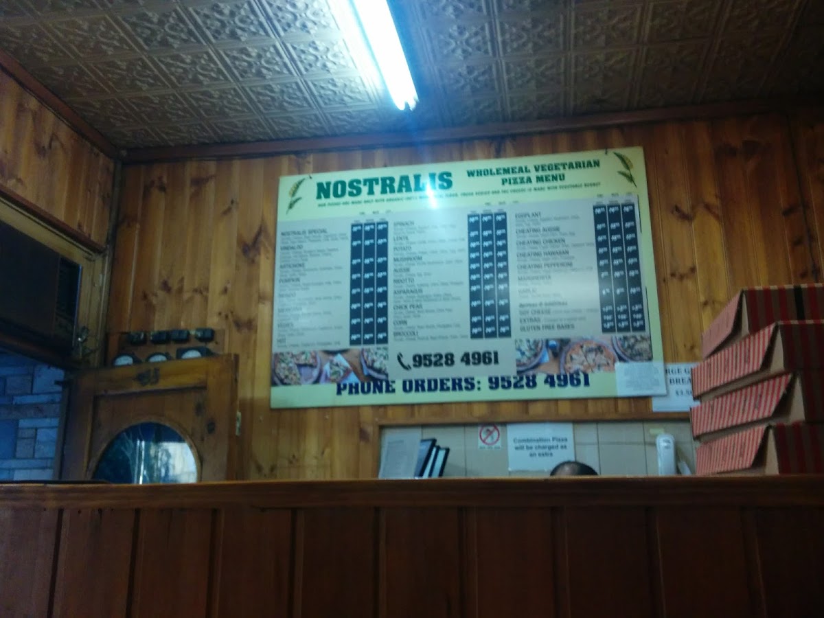The menu at Nostralis Wholemeal Vegetarian & Vegan Pizza offers a delightful selection of pizzas and other items catering to vegetarian and vegan preferences. The Medium Pizza section features unique options such as Eggplant Pizza, Chick Peas Pizza, Hot PizzaCorn Pizza, and Pumpkin Pizza, each offering a different combination of flavors. For larger appetites, the Large Pizza options include Hot Pizza, Lentil Pizza, Asparagus Pizza, Mushroom Pizza, and Pumpkin Pizza. Smaller portions are available in the Small Pizza range, with choices like Asparagus Pizza, Pumpkin Pizza, Ridotto Pizza, Vindaloo Pizza, and the popular Cheating Aussie. If you're in the mood for a combination, the restaurant also offers Single Combo, Double Combo, and Family Combo, providing a variety of tastes in one meal. On the side, the Garlic Bread is a perfect addition. For beverages, diners can choose from Water, Juice Glass Bottle, Bundaberg Glass Bottle Soda, and Coke 1.25L. A small but convenient selection of Single-Use Items like Straw, Napkins, and Cutlery are also available. To satisfy your sweet tooth, don't miss the Vegan Cake of the Day, a perfect vegan dessert to end your meal. With a range of pizzas, combos, and sides, Nostralis offers a variety of options that cater to both vegetarians and vegans, ensuring a satisfying meal for all.